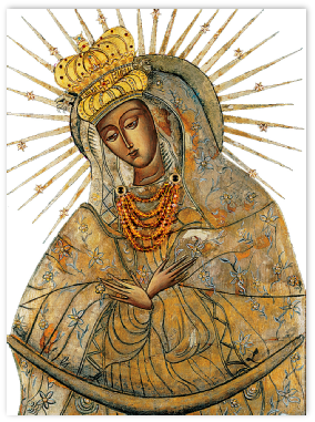 L’auteur du tableau original fut un peintre anonyme de la Renaissance néerlandaise du XVIIème siècle. Cette Vierge fut solennellement transférée en l’église Sainte-Thérèse d’Avila de Vilnius en 1671. A la suite de nombreux grâces et miracles, la vénération envers cette image miraculeuse s’est répandue dans toute la Pologne au point qu’en 1927, Notre-Dame d’Ostra Brama fut proclamée solennellement Reine de la Pologne.